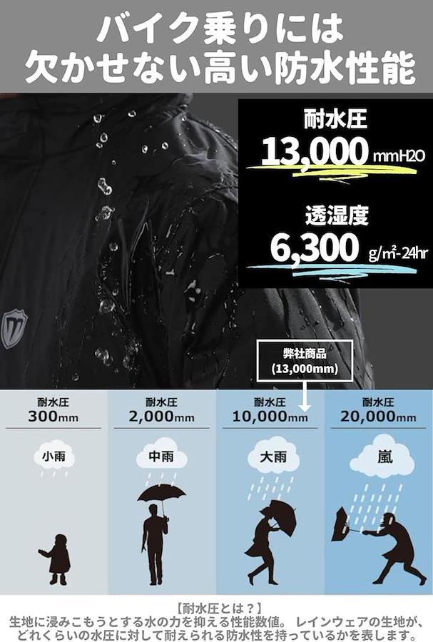 「大雨にも耐えられる高い防水性」耐水圧13,000mmと高い防水性能となっており、雨の中でのバイクや自転車を運転することを想定した高い機能を備えています。