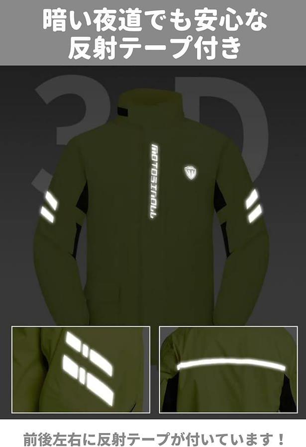 「暗闇で光る反射テープ付き」前後左右に暗闇で光る反射テープが付いているため、バイクなどでの運転時に周囲から認識されやすくなり、安心して運転することができます。