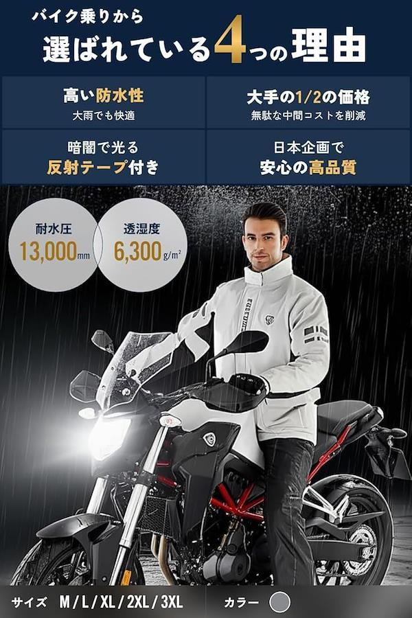 そんな方にもおすすめできる高いデザイン性に加えて、 雨具に適した素材を使用しているので、防水性が良いのはもちろんのこと、通気性がよく蒸れにくいのでバイクや自転車での利用はもちろん、災害時などにも役立つウェアです。