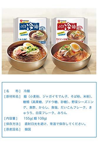 [名称] 冷麺[原材料名] 麺(小麦粉、ジャガイモでん子、そば粉、米粉)、糖類(高果糖、ブドウ糖、砂糖)、野菜シーズニング、食酢、からし、食塩、だいこんフレーク、きゅうり、白菜フレーク、みりん[内容量] 155g(麺108g)[保存方法] 直射日光を避け、常温で保存してください。[原産国名] 韓国