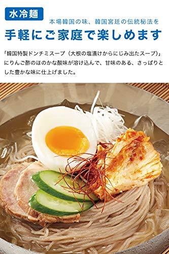 本場韓国の味 水冷麺、韓国宮廷の伝統秘法を、手軽にご家庭で楽しめます。「韓国特製ドンチミスープ(大根の塩漬けからにじみ出たスープ)」にりんご酢のほのかな酸味が溶け込んで、甘味のある、さっぱりとした豊かな味に仕上げました。お好みにより、キムチ・刻みネギ・きゅうり・ゆで卵などと、氷を加えるとさらにおいしく召し上がれます。内容量:1袋155g(麺108g) ×4袋【重要】メーカーによる商品リニューアルに伴いパッケージ(内容量も含む)変更が行われた場合、新パッケージでお届け致します事ご了承願います。