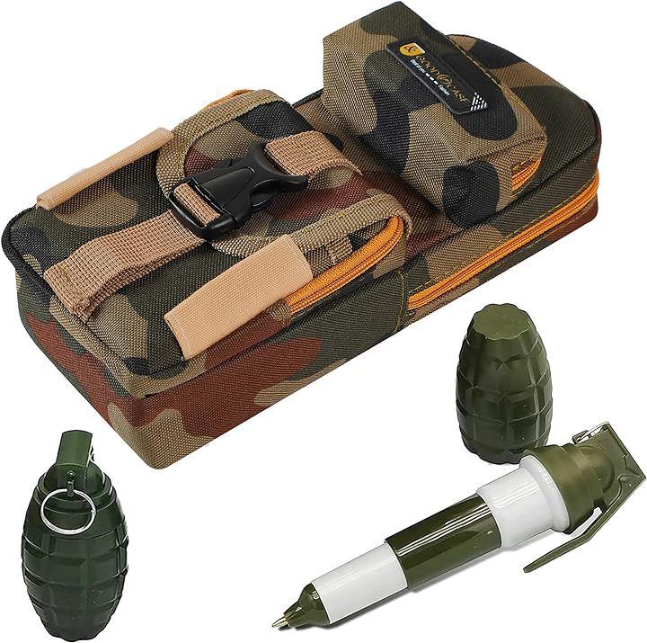 とてもユニークなこのペンケースの特徴は、手榴 弾をモチーフにしたオブジェが2つ付属します。