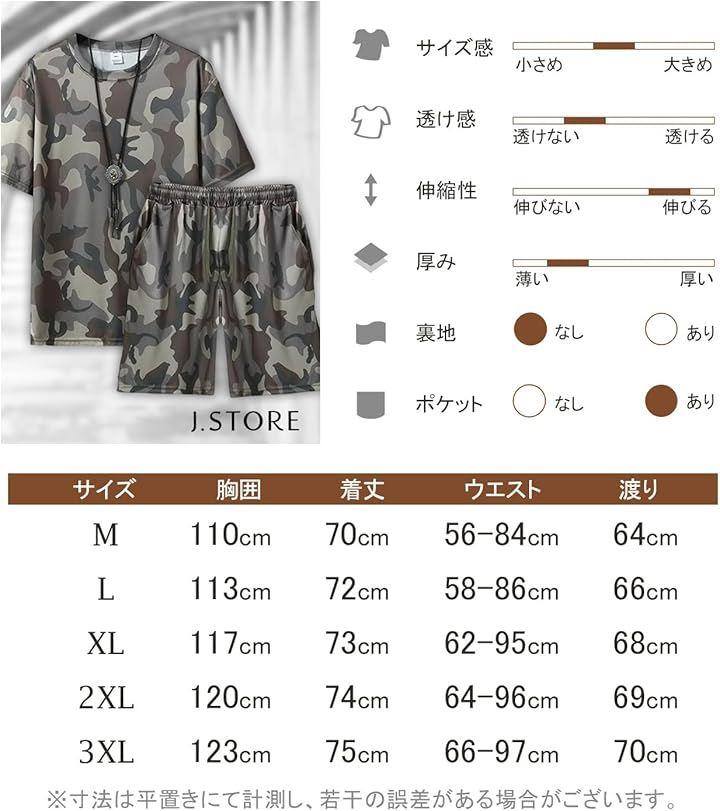 サイズ:肩幅/胸囲/袖丈/着丈 「M」55/110/23/70 「L」56/113/24/72 「XL」57/117/25/73 「2XL」58/120/25/74 「3XL」59/123/26/75 サイズ:ズボン丈/ウエスト(ゴムある)/ヒップ/渡り 「M」49/56/84/106/64 「L」51/58/86/110/66 「XL」52/62/95/116/68 「2XL」53/64/96/118/69 「3XL」54/66/97/120/70