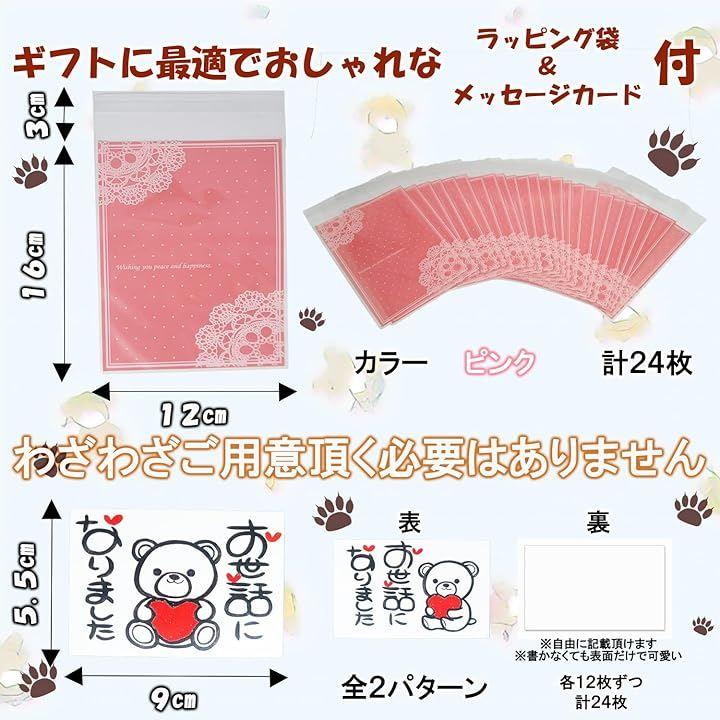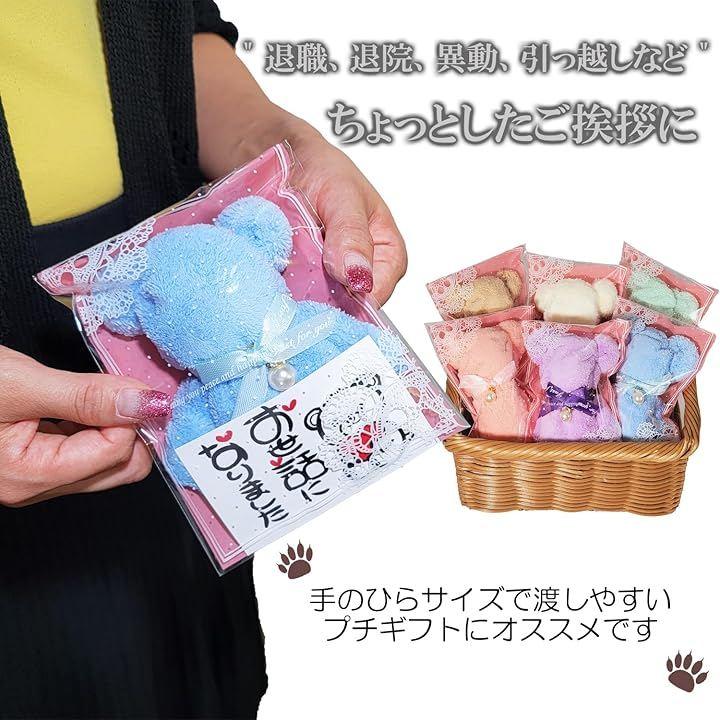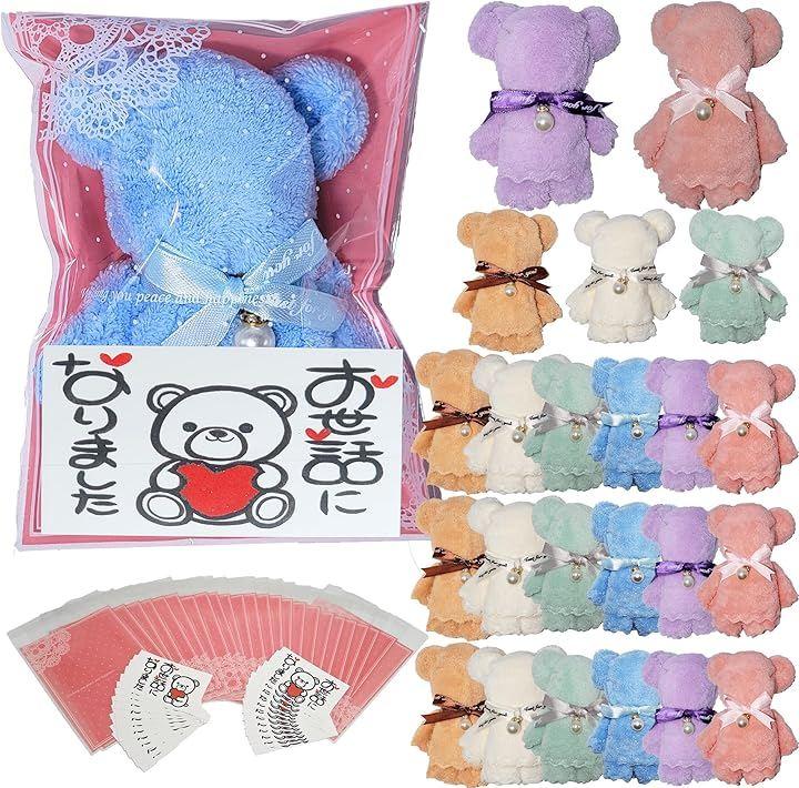 「内容量」 ・Bearタオル 6色x4 計24個 サイズ13cmx10cm 素材 ポリエステル ・ラッピング袋 1色x24 計24枚 サイズ16cmx12cm ・メッセージカード 2種x12 計24枚 サイズ9cmx5.5cm