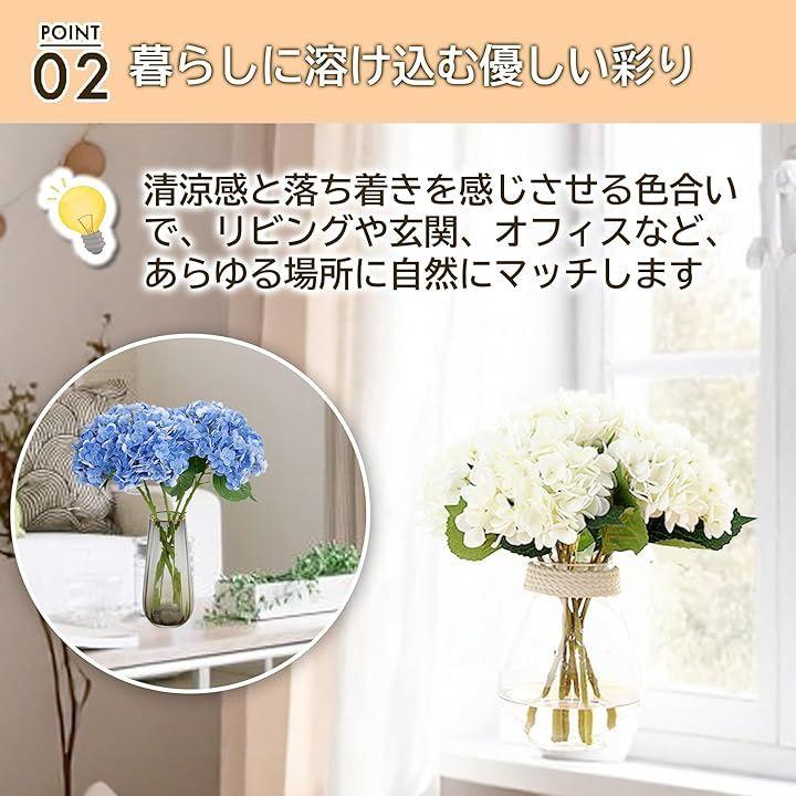 「暮らしに溶け込む優しい彩り」白や青を基調とした紫陽花は、清涼感と落ち着きを感じさせる色合いで、リビングや玄関、オフィスなど、あらゆる場所に自然にマッチします。