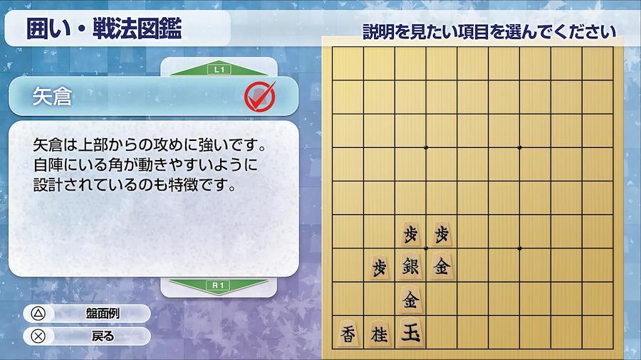 対局中に「美濃囲い」や「穴熊」、「中飛車」、「超速3七銀」などの囲い・戦法を使用するとその名前のエフェクトが表示され対局を盛り上げます。また使用した囲い・戦法はその説明など解説を見ることができます。