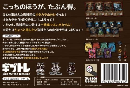 ゲームデザイン:かくイラストレータ:OBOttoプロデューサー:ZUME盗賊団のオタカラ山分けタイム!自分だけ“ちょっと得”したい盗賊団メンバーとなり、お金持ちを目指しましょう。2人でバチバチ、3~4人でワイワイ遊べる、心理戦カードゲームの新定番です!5枚のカードを分けるギミックと1枚のウラ向きカードが、シンプルで奥深い駆け引きを生み出します。・本作は、BoardGameSelection2020にて店舗賞を受賞した『ガラクタリウム』のリメイク作です。・クラウドファンディングにて、国内で535人のバッカーを獲得・Youtubeにて、マーマンAsobiチャンネル様、ボドゲかぞく様、遊ボード様によるプレイ実況動画が公開済み 【プレイ人数】2~4人 【プレイ時間】15~30分 【対象年齢】9歳以上 【素材】紙