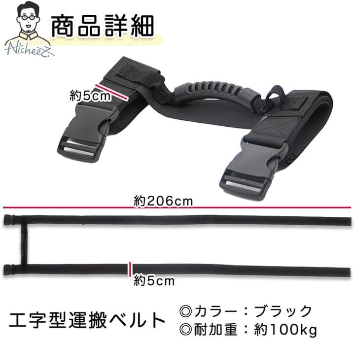 「商品内容」工字型運搬ベルト カラー:ブラック サイズ:ベルト長さ/約206cm ベルト幅/約5cm 重量:352g 耐加重/約100kg