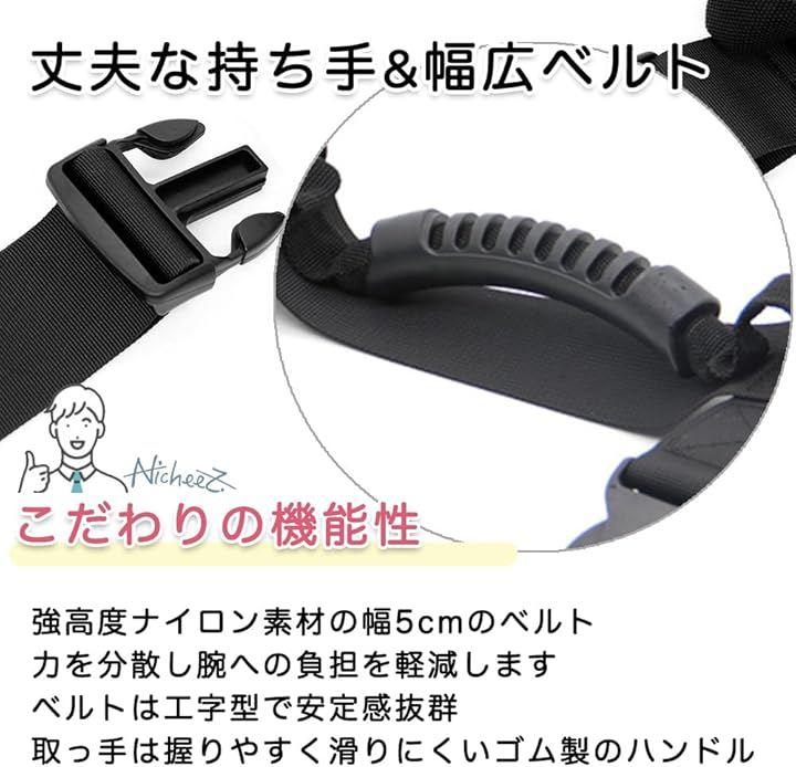 「丈夫な持ち手&幅広ベルト」強高度ナイロン素材の幅5cmのベルトで力を分散し、腕への負担も軽減します。