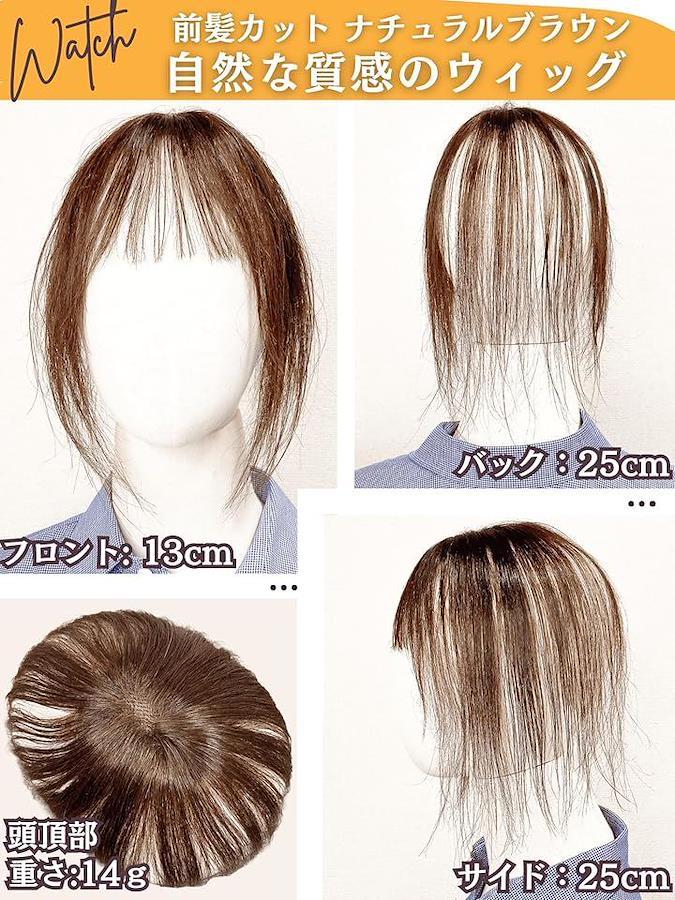 「商品詳細」(3)サイズ:ベース 縦8x6cm (4)重さ:約14g (5)カラー:ナチュラルブラウン (6)デザイン: 前髪カット フロント13cm バック25cm サイド25cm (7)用途: うぃっぐ 部分ウィッグ かつら 中高年 ハゲ隠し