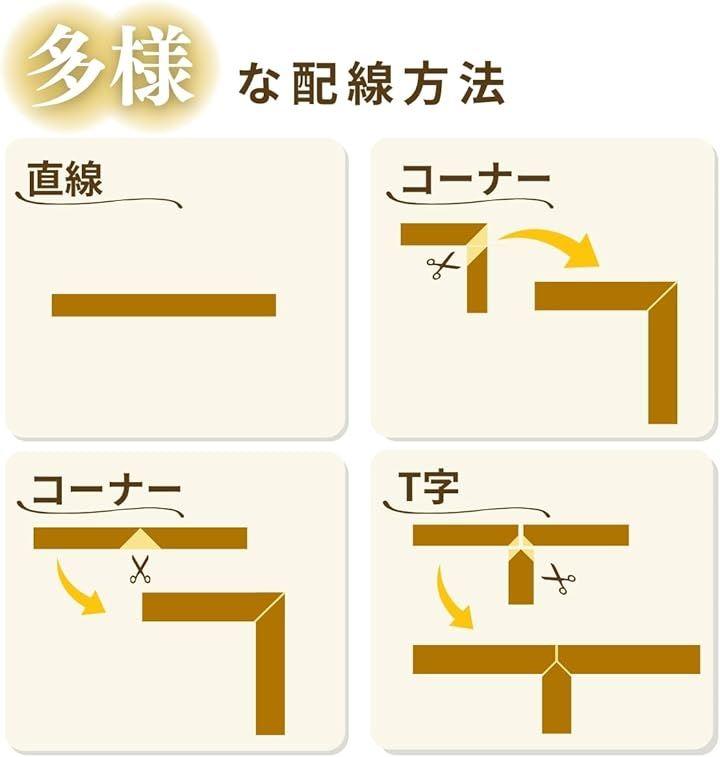 「複雑な配線にも対応|T字・角・直線すべてOK」 デスクやテレビ周辺、壁沿いの配線も、T字分岐・曲線・直線など自在にレイアウト可能。