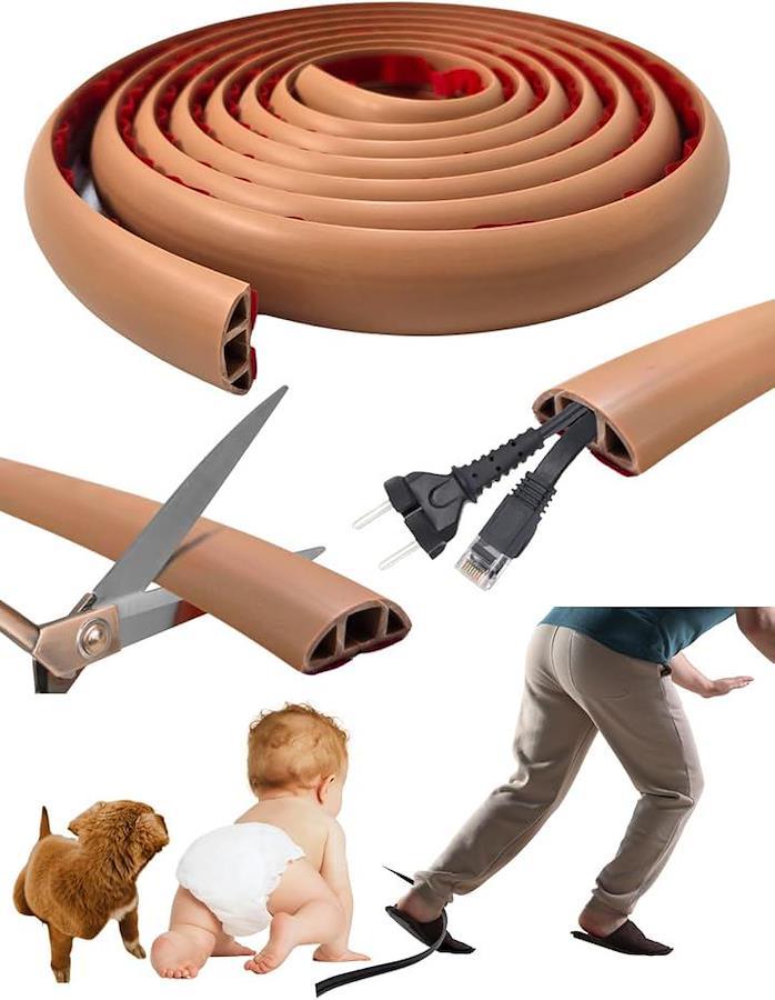 「高品質PVC素材使用|柔らかく安全な配線カバー」 やわらかいPVC素材を使用し、お子さまや高齢者、ペットがうっかり踏んでも痛くない安心設計。
