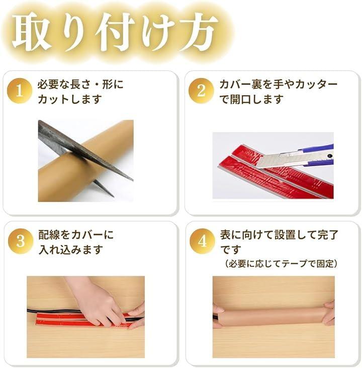 「配線カバーの取り付けに工具いらず|カット&貼るだけの簡単設置」 はさみで必要な長さにカットし、裏面の粘着テープをはがすだけ。