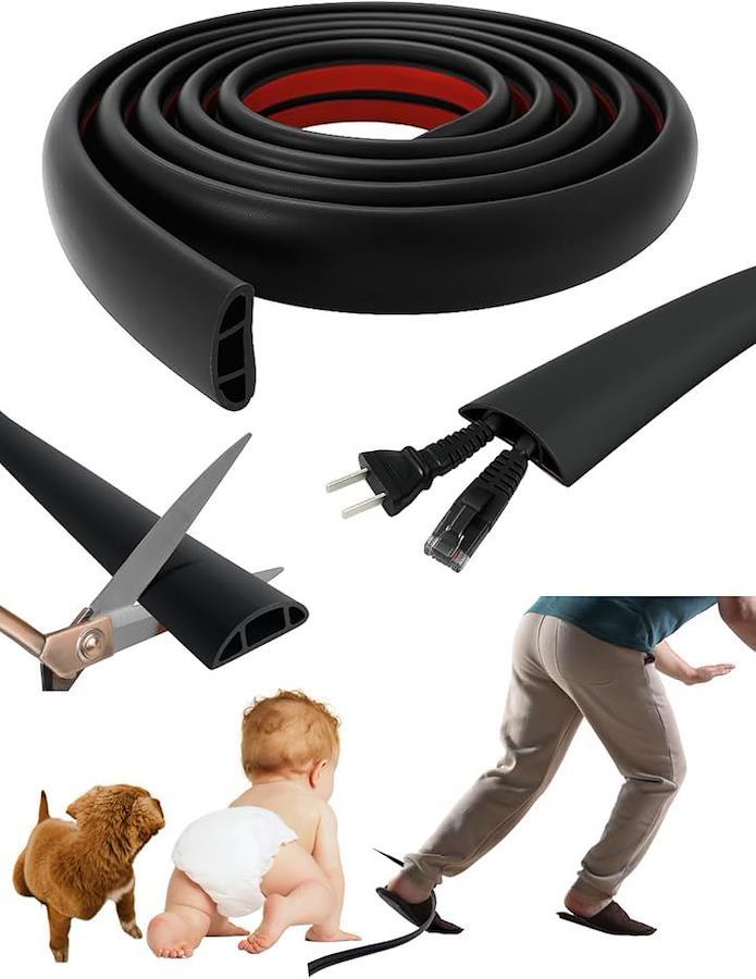 「高品質PVC素材使用|柔らかく安全な配線カバー」 やわらかいPVC素材を使用し、お子さまや高齢者、ペットがうっかり踏んでも痛くない安心設計。