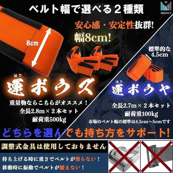 ベルト幅で選べる2種類標準的なベルト幅4.5cm長さ2.7mの「運ボウヤ」と極太ベルト幅8cm長さ2.8mの「運ボウズ」から選べます。