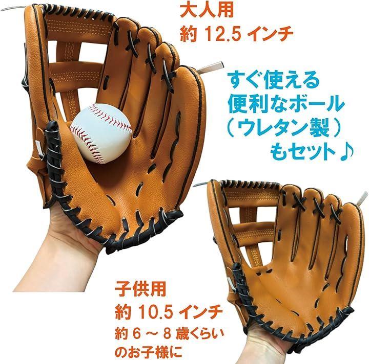 軽いキャッチボールに最適。(本格的なグローブではありません) 大人一般用12.5インチグラブと6~10歳くらいのお子様用10.5インチグローブのセットです。