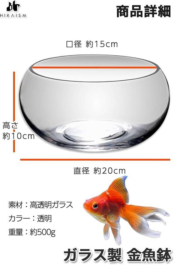 「商品詳細」ガラス製金魚鉢 素材:高透明ガラス カラー:透明 サイズ:直径 約20cm x 口径 約15cm x 高さ 約10cm 重量:約500g