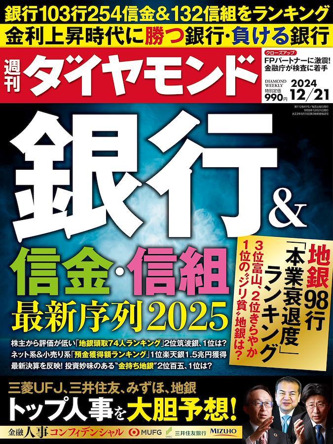 「Part 2」金利上昇時代に勝てる銀行・負ける銀行 銀行「本業衰退度」ランキングジリ貧筆頭は長野、勝ち組は伊予 4指標で測る地銀の"本業力"株主賛成率とPBRで市場評価を判定 地銀頭取74人ランキング(Interview)高橋靖英●大分銀行頭取(Column)楽天銀行1.5兆円獲得で圧倒 小売り系銀行は賞味期限切れ?