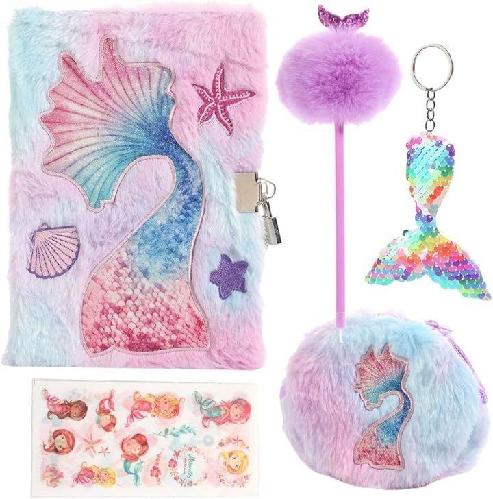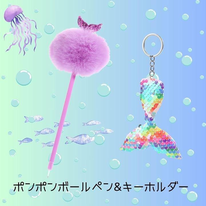 豪華な5点セットで毎日が楽しくなる ファー付きボールペン、キラキラの人魚キーホルダー、ふわふわポーチ、可愛いステッカーが含まれた豪華なセット。