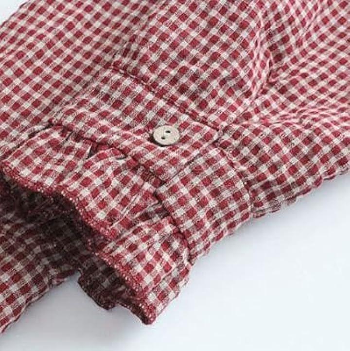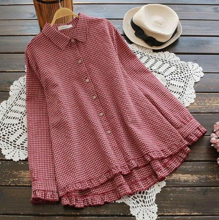 長袖 チェック柄 ブラウス レディース シフォン チュニック 襟なし レッド