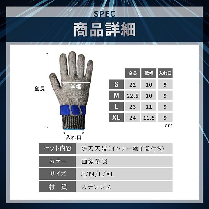 「商品詳細」セット内容:防刃天袋(インナー綿手袋付き) カラー:画像参照 サイズ:S/M/L/XL 材質:ステンレス *モニターの環境により、色の見え方に若干差が生じる場合がございます。
