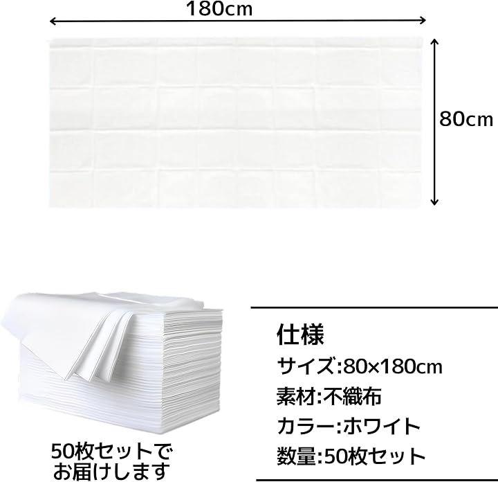 「仕様」サイズ:80x180cm、素材:不織布、カラー:ホワイト、数量:50枚セット
