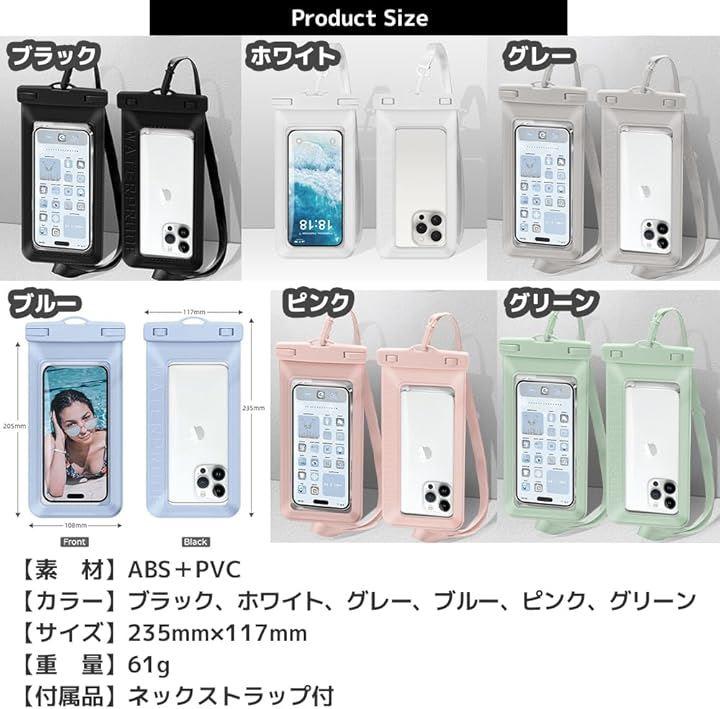 「素材」ABS+PVC「カラー」ブラック、ホワイト、グレー、ブルー、ピンク、グリーン「サイズ」235mmx117mm「重量」61g「付属品」ネックストラップ付