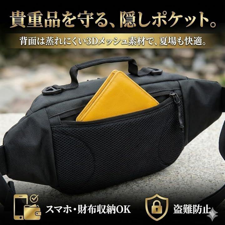 ショルダーバッグとして肩掛け、ウエストポーチとして腰装着、さらに斜め掛けにも対応。