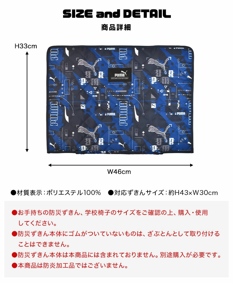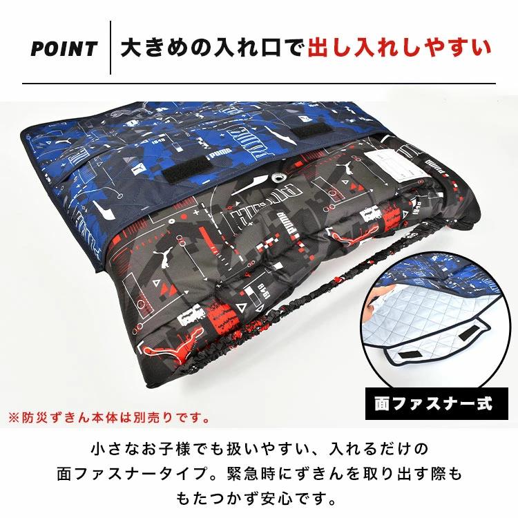 【防災ずきんカバー】別売りの防災ずきんとお揃いのPUMA柄カバー。平常時にずきんを背もたれやざぶとんとして使用する際、より快適に使っていただけます。取り出し口が大きいので、ずきんを実際に使う緊急時ももたつかず安心です。お揃い柄でぴったりサイズの防災ずきんも別売しております!