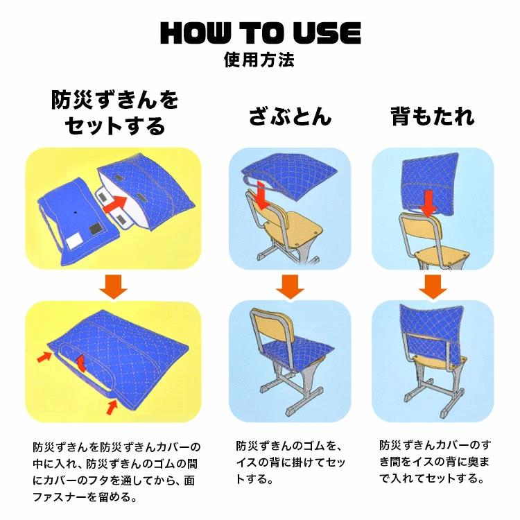 ■ご注意※お手持ちの防災ずきん、学校椅子のサイズをご確認の上、購入・使用してください。※防災ずきん本体にゴムがついていないものは、ざぶとんとして取り付けることはできません。※防災ずきん本体は本商品には含まれておりません。別途購入が必要です。※本商品は防炎加工品ではございません。※表記サイズより、多少の誤差があることがございます。※商品の画像はできる限り実物に近づけるよう配慮しておりますが、お使いのモニターやご覧になる環境によりましてはカラーの見え方に差が出る場合がございます。ご了承くださいませ。
