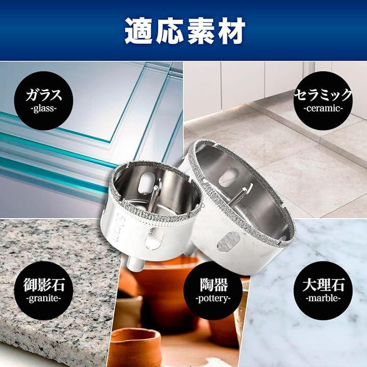 電気ドリル、充電式ドリルドライバー 、ボール盤にとりつけて、ガラス、タイルはもちろん、大理石、花崗岩などの穴開けにも対応可能。