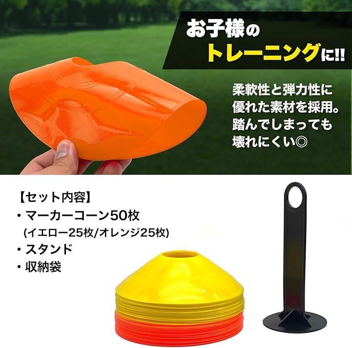 全5色(赤・青・黄色・オレンジ・黄緑)セットと、黄色25枚+オレンジ25枚セットの2種類から選べるマーカーコーン。