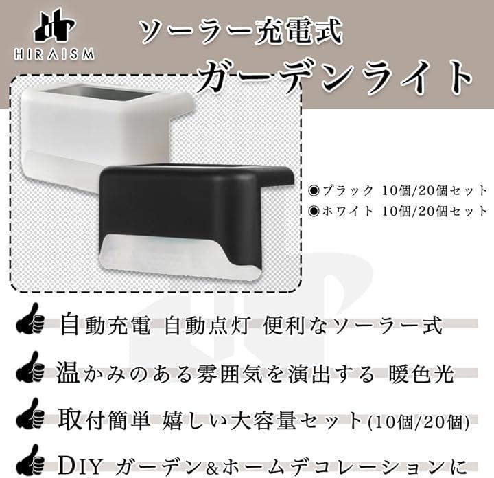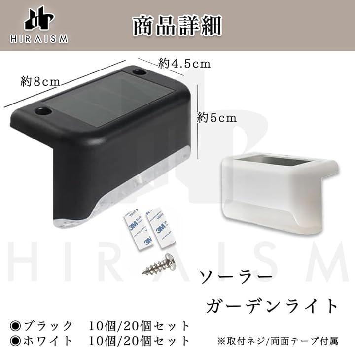「商品内容」ガーデンライト(ソーラーライト) セット数:10個 付属:ネジ、両面テープ カラー:ブラック サイズ:縦4.5cm 横8cm 高さ5m 材質:ABS アクリル