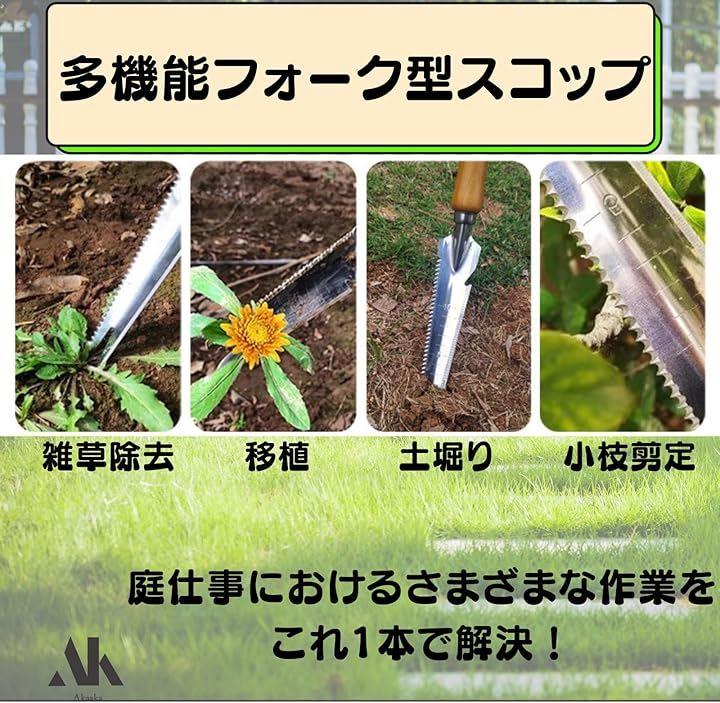 雑草や植栽作業を簡単に、効率よく処理 この多機能フォーク型スコップは、雑草の除去だけでなく、植栽や草刈り、土起こしなど、庭仕事におけるさまざまな作業を1本で解決します。