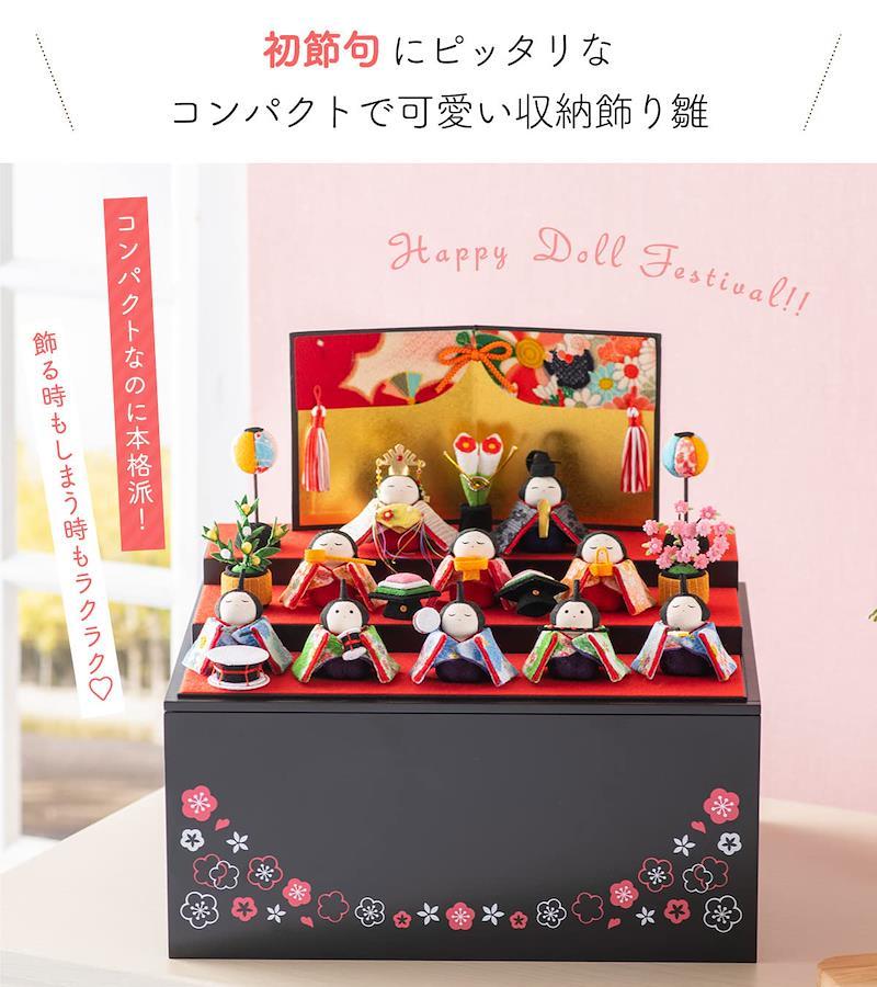 ?【令和生まれの令花雛】飾り台が収納箱にもなる、コンパクトな収納段飾りです。収納箱のふたを裏返すとひな段になっていますので、そのままお飾りいただけます。お片付けのときは、すべてを黒い箱におさめ、ひな段を裏返してふたにします。10人揃いのお雛さまなので、コンパクトでもお部屋が華やかに。現代の住宅事情に合った新しい機能的なお雛さまです。 【雛人形サイズ(cm)】全体-幅約30/奥行24/高さ28・女雛-幅約6.6/高さ5.5 素材:レーヨンちりめん・レーヨン・桐 重量:約2500g 生産国:日本 【お届け内容】お雛さま・お内裏さま・三人官女・五人囃子・雪洞・桜橘・菱餅・花器・屏風・木製収納箱 (兼 飾り台) ※人形の飾り台兼収納箱【意匠登録出願済】 お人形は、京都の人形工房リュウコドウによるもので、職人がひとつひとつ丁寧に仕上げています。そのため、お顔の表情やお着物の柄などに個体差が生まれますが、同じものがふたつとない一点ものです。また、予告なく細部に多少の変更が生じる場合もございます。その他、仔細についても個体差がありますこと あらかじめご了承くださいませ。
