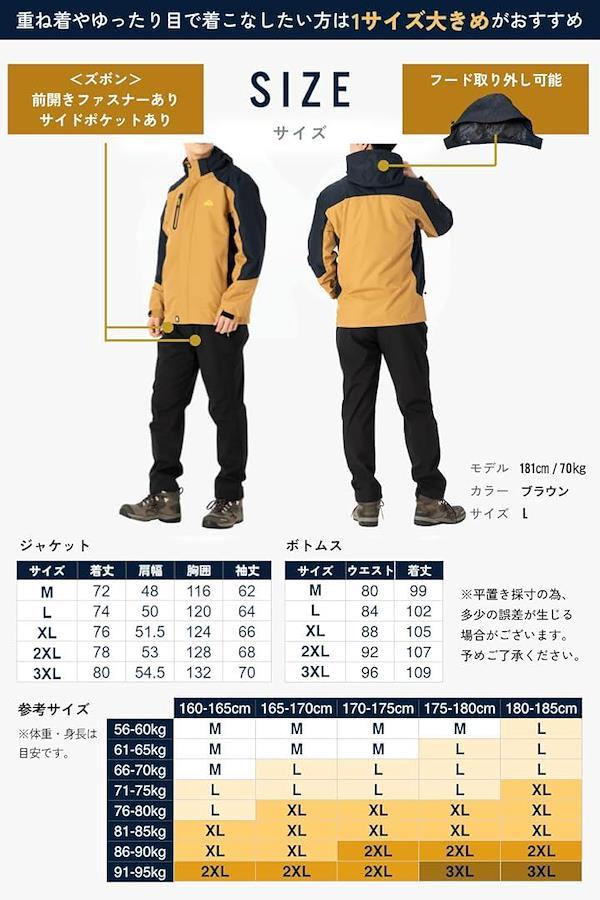 「機能」*ジャケット:防水・撥水加工(耐水圧15,000mm)、防風、防寒 *速乾トレッキングパンツ:防水・撥水加工(耐水圧8,000mm)、防風、速乾、伸縮