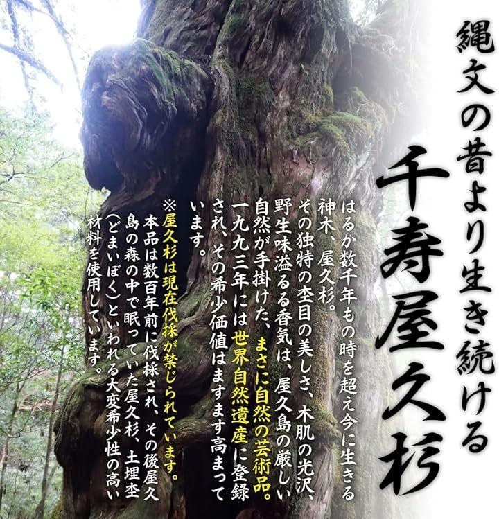 「希少品」商品に使用している土埋杢(どまいぼく)と言われる倒木は数百年もの間、屋久島の森の中に切り倒されたまま眠っていた神木で、その「節・色・艶」が一品一品異り、同じ杢目(もくめ)が一つとない、この上ない風合いは自然界からの贈り物です。