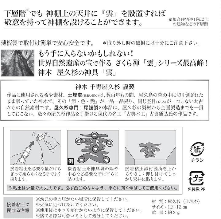 神木・屋久杉謹製の 「 雲 」を設置する事で、より神様に敬意を持った神棚・仏壇飾りになります。