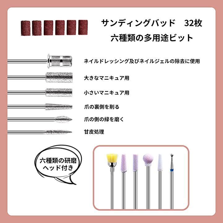・「11 in 1多機能ネイルケア」届いてすぐに使えるように、ビットセットが使いやすい6種類のビット、6種類の研磨ヘッド、32枚サンディングバッドが付属、研削、研磨、甘皮除去など、プロ仕様で全てのご要望を満たす。