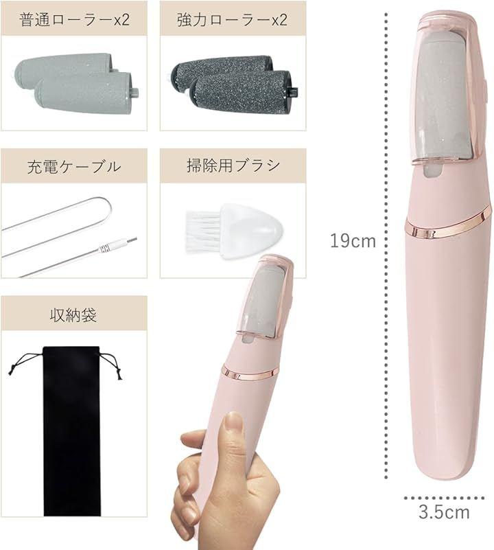 セットには以下が含まれています:電動角質リムーバーx1、普通ローラーx2、強力ローラーx2、充電ケーブルx1、クリーニングブラシx1、取扱説明書x1