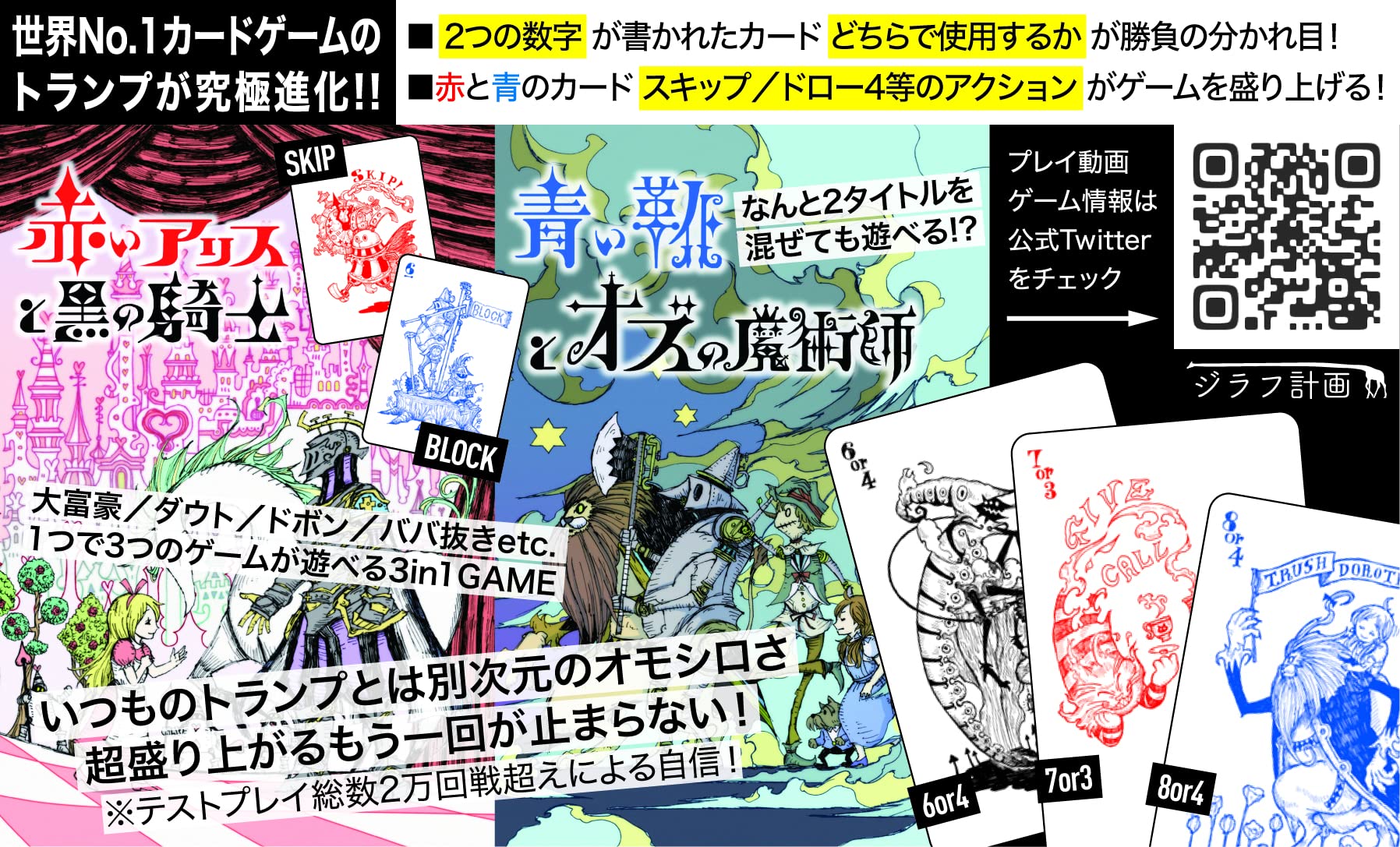■商品説明ジャンル:パーティーカードゲーム/進化トランプ モチーフ:オズの魔法使い 対象年齢:子供から大人まで 所要時間:10-20分 プレイ人数:2-6人 内容物:カード32枚/ルールブック1枚?もっと見る■進化トランプ(主な違い) いつもと少し違う新感覚トランプです ・0から10までの数字があります ・全部で32枚しかありません ・2つの数字から選べるORカードがあります ・トランプ特有のスート(マーク/柄)がなく代わりに青と黒のカードがあります ・青のカードはブロックやドロ4等の文字が書かれていてそれぞれアクションが起こせます ■世界観 オズの魔法使いの登場キャラクターたちがボールペンアートのタッチで大集合 主人公のドロシーは勿論、カカシ、ブリキの木こり、臆病ライオン、オズの魔法使い、西の悪い魔女、北の良い魔女のメインキャラクターに加えて、映像化されていない続編の人気キャラクターのジャック、チクタク、チップ、オズマ、カエルマンまで登場します■3in1Game 3つの遊べるゲーム これ1つでストーリーに合わせた3つのゲームが遊べます ・第一章 Shoes(シューズ) 竜巻で飛ばされたドロシーの靴を探して揃えよう ババ抜き×人狼 ・第ニ章 Liar(ライアー) レンガ道を辿って行きオズの魔法使いの嘘を見破ろう ダウト×ドボン ・第三章 Quartetto(カルテット) 仲間で力を合わせてカンザスに帰ろう ポーカー×色合わせ■なんとなく分かる遊び易さどのゲームも遊んだことがあるような既視感があってすぐに夢中になれます 心理戦要素もあって駆け引きが楽しめます逆に難しいことは考えずに直感だけでもライトにプレイできる気軽さもあります 勝っても負けてももう一回が止まりません■親子でおうち遊び難しいルールは無いため大人だけでなくお子様とも楽しくお遊びいただけますイラストを楽しんだりなど知育玩具としてもご活用ください■豊富な追加ルール慣れてきた方や大人は説明書の追加ルールを足して遊んでみてください 逆転要素が格段に増えて手に汗握る展開となり何倍も盛り上がります■混ぜても遊べる 「赤いアリスと黒の騎士」と混ぜて遊ぶこともできます それぞれのゲームをやり込んだ後はぜひやってみましょう 公式ミックスルールはwebにて随時公開予定になります ■特徴 ジャンル:パーティーカードゲーム/進化トランプ 知育:知育玩具として推奨 発売元:ジラフ計画official 所要時間:10-20分 プレイ人数:2-6人 内容物:カード32枚/ルールブック1枚 モチーフ:オズの魔法使い