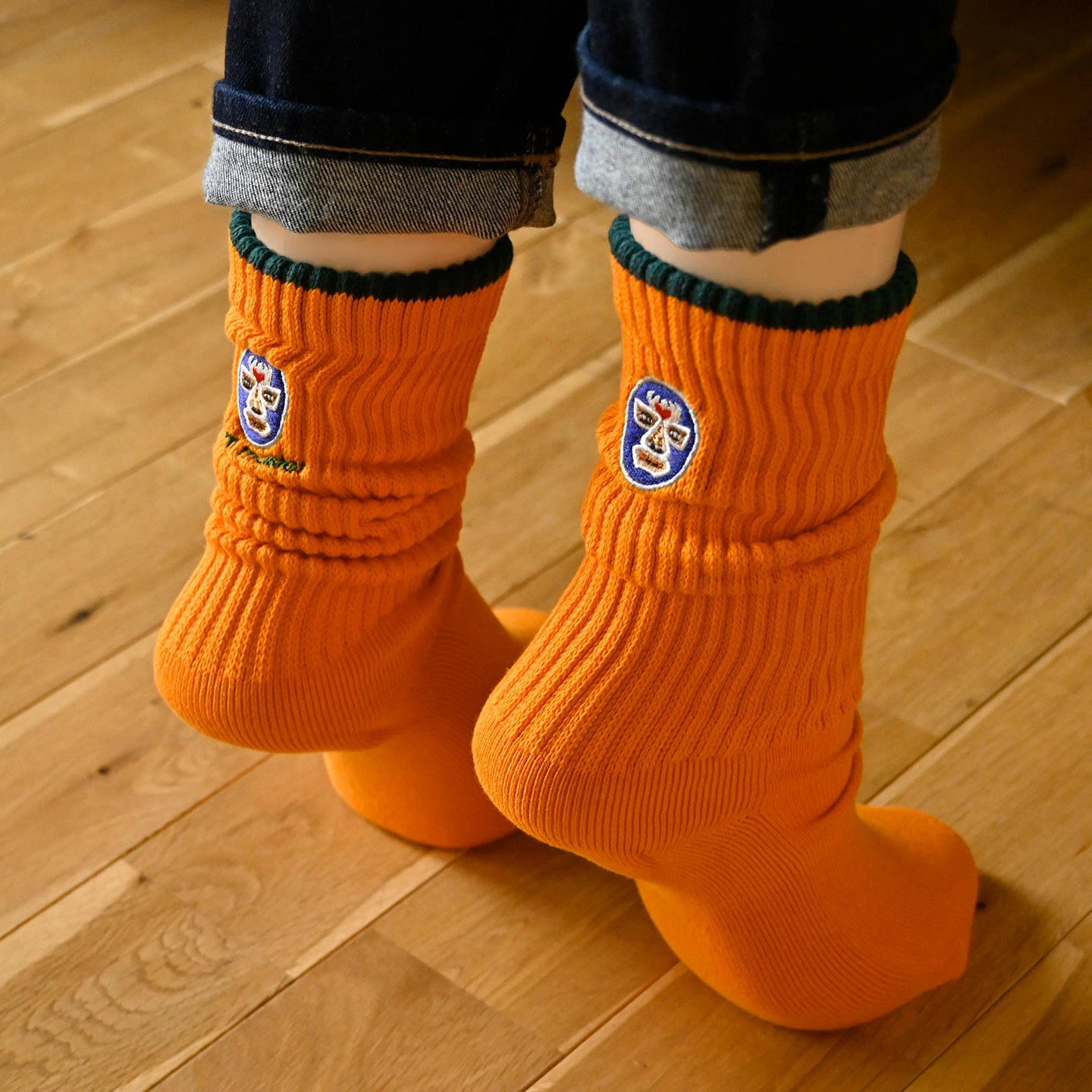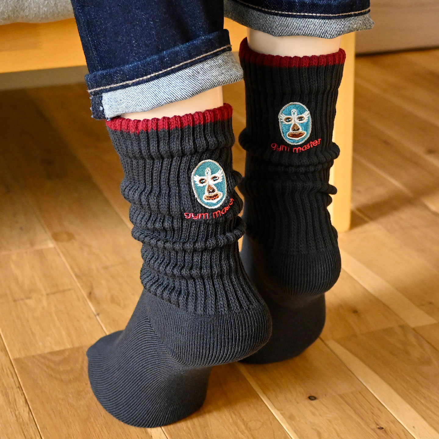 【覆面レスラー刺繍ソックス】おちゃめなレスラー刺繍がワンポイント!くしゅっと履くのがかわいい柔らかリブ素材のルーズソックス。抗菌防臭がされており、足裏は柔らかく通気性の良いパイル生地でどんな季節でも履き心地◎