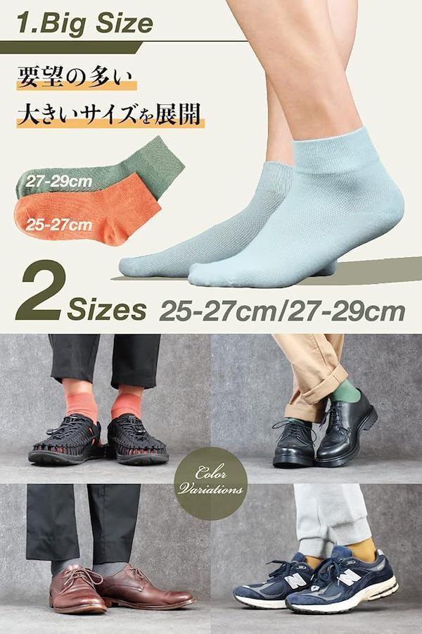 「2サイズのハーフソックス」25、26、27cmの普通サイズと、27、28、29cmの大きいサイズの2サイズをご用意しています。