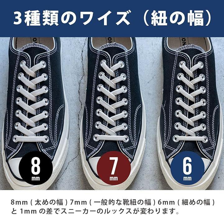 「スニーカーに合わせて選べるサイズ」 長さは80cm~180cmまで6種類(*180cmは8mm幅のみ)、幅は6mm / 7mm / 8mmの3タイプをご用意。