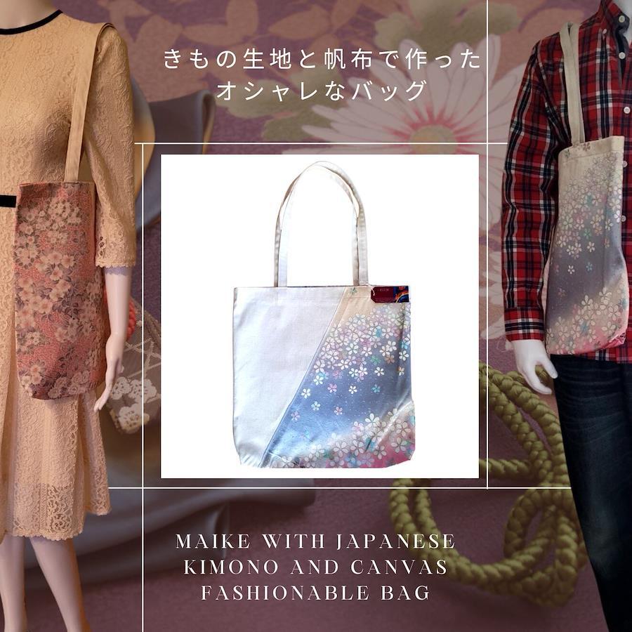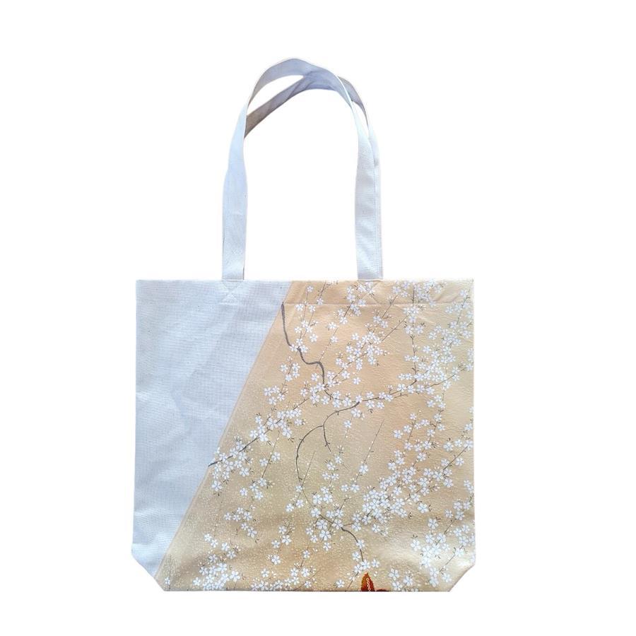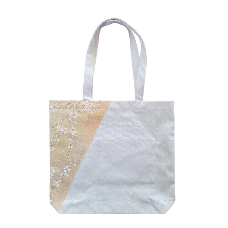 訪問着を使用したゴールド系のカラーをベースとした帆布バッグ。日本らしい梅のはな柄がとても美しい一品になります。 素材/材質 :シルク100%(正絹)と帆布生地を使用しております。サイズ/寸法:縦:40cm 横:40cm マチ:8cm 持ち手:55cm注 意 :モニター発色の具合により色合いが異なる場合がございます。■着物生地から作ったオリジナルバッグ。■着物生地から作ったオリジナルバッグエコバックにも利用できるトートバッグになります。■着物ならではの色合いと高級感あふれる美しい一品になります。