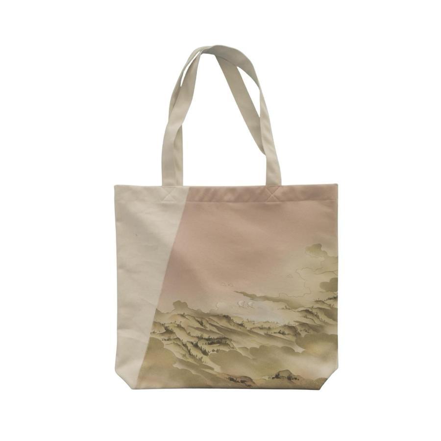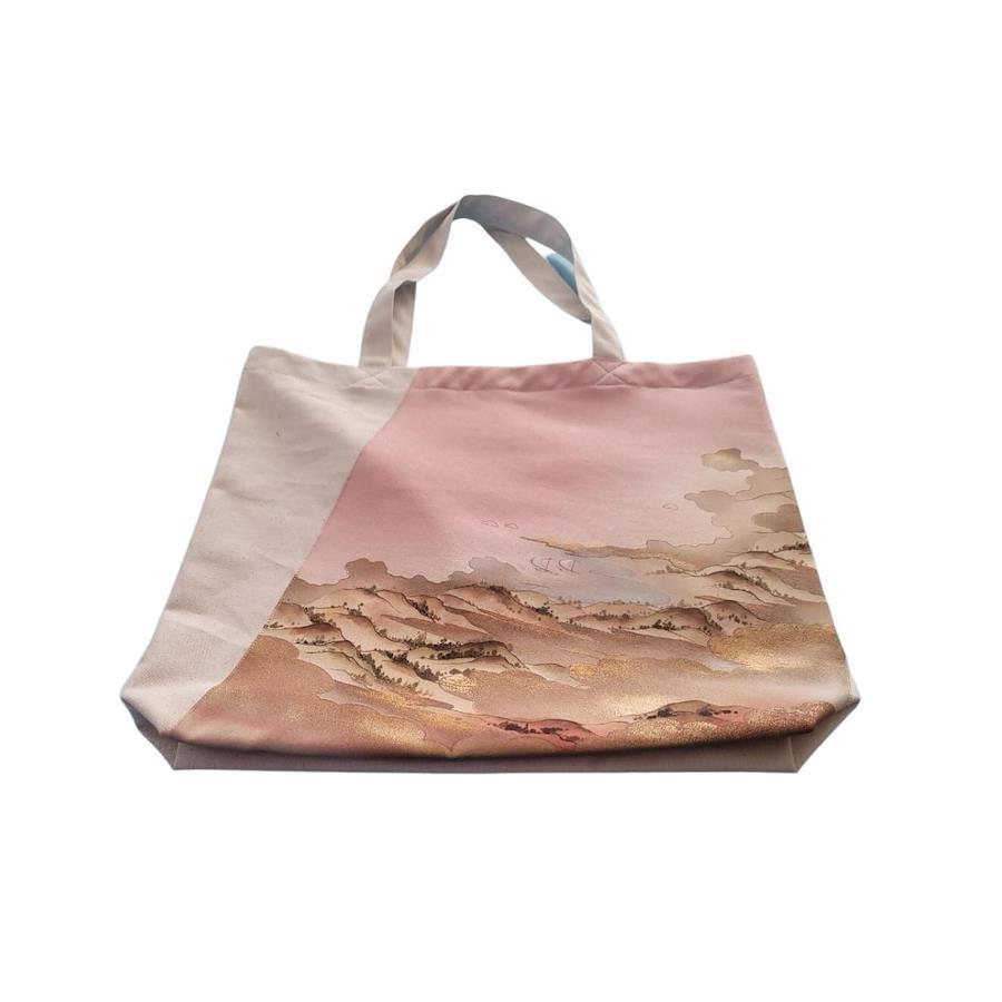 色留袖から作った優雅な帆布バッグ。 ピンクをベースとしたカラーに日本の絵画が描かれ雲の部分には金箔がほどこされている落ち着きのある作品になります。 素材/材質 :シルク100%(正絹)と帆布生地を使用しております。サイズ/寸法:縦:40cm 横:40cm マチ:8cm 持ち手:55cm注 意 :モニター発色の具合により色合いが異なる場合がございます。■着物生地から作ったオリジナルバッグ。■着物生地から作ったオリジナルバッグエコバックにも利用できるトートバッグになります。■着物ならではの色合いと高級感あふれる美しい一品になります。