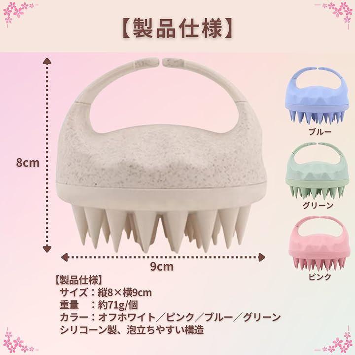 「製品仕様」 サイズ:縦8x横9cm(1個)、重量:71g/個、カラー:オフホワイト/ピンク/ブルー/グリーン、シリコーン製、泡立ちやすい構造、2個セット。