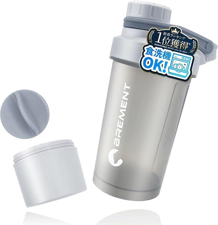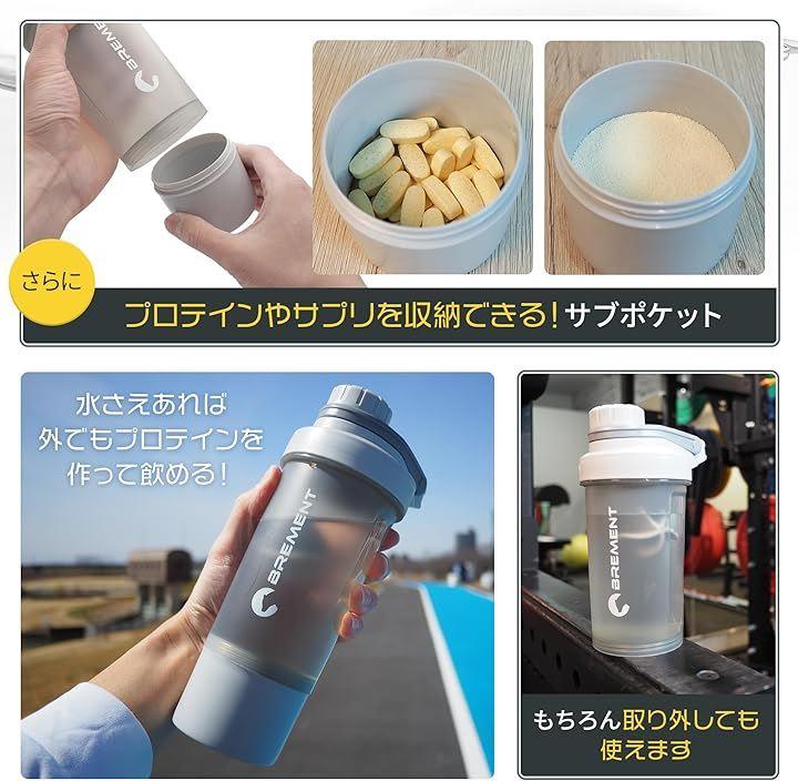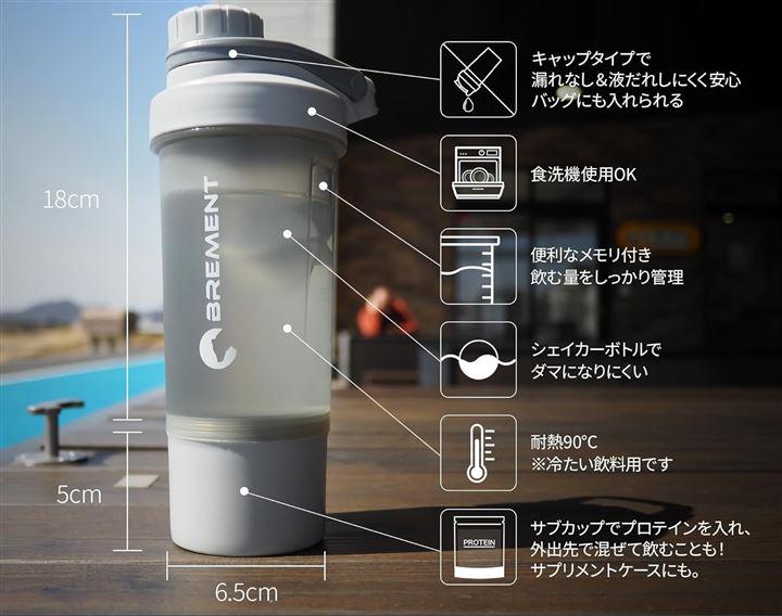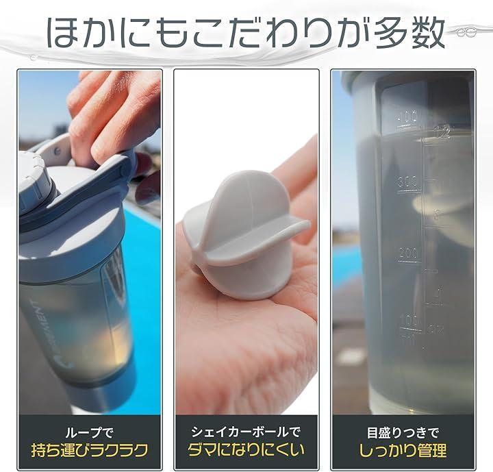 プロテインやサプリを入れて持ち運び、水さえあれば外でプロテインを作って飲むことが可能です。シェイカーボールも付属。