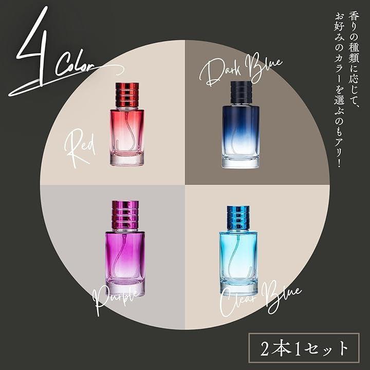 「セット内容」アトマイザー2本セット 「容量」各30ml 「カラー」ダークブルー レッド クリアブルー パープル(グラデーションガラス仕様) 「素材」ガラス(ボトル部) プラスチック・金属(スプレー部) 「用途」香水 化粧水 ヘアスプレー アルコール携帯用容器