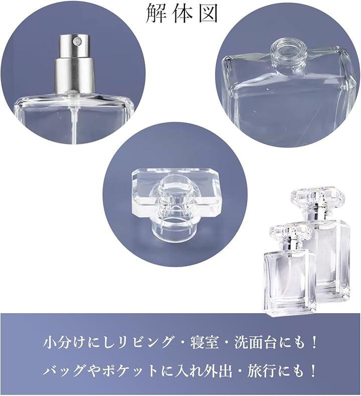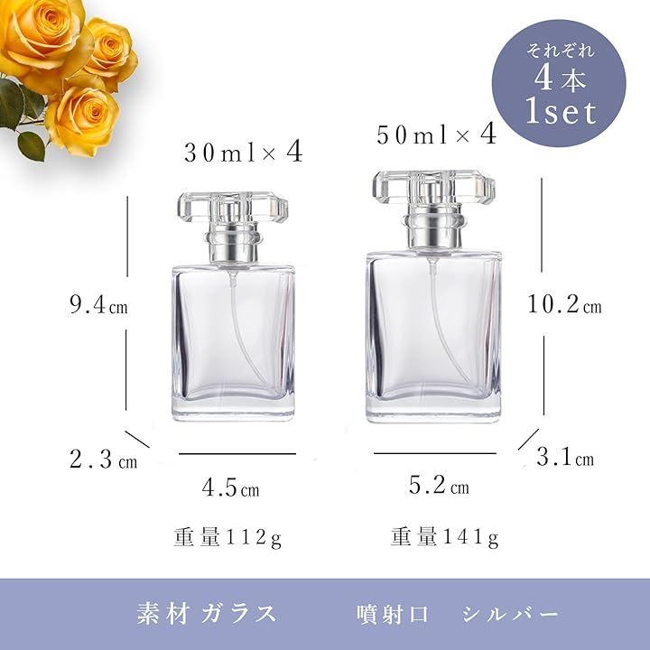 サイズ: 全長 約90mm、ボトル底部 約45mm 容量: 30ml / 50ml 重量: 112g (30ml)、141g (50ml) 素材: 高品質ガラス 特徴: 液漏れ防止設計、逆さにしても安心 用途: 香水、化粧水、アロマオイル、虫よけ、水、洗剤など